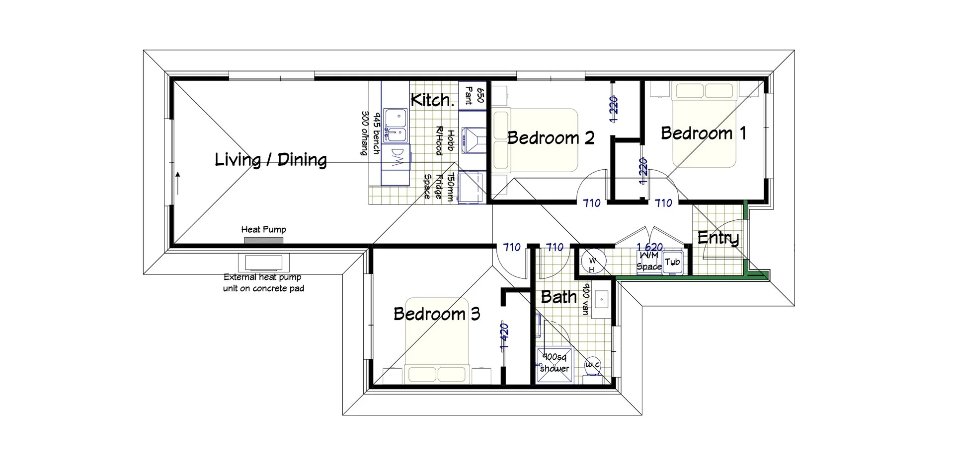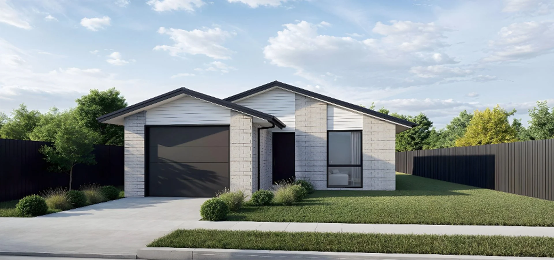 A popular first home design from Glen Armstrong Buidlers. Made for those who need a bit more space in their at-home lives. It offers high ceilings and a central open-plan living area with an indoor-outdoor flow. The master bedroom stretches across one end of the house with its own ensuite, connected via a walk-in wardrobe. The other end you have two more bedrooms and a second bathroom. *Price does not include decking.